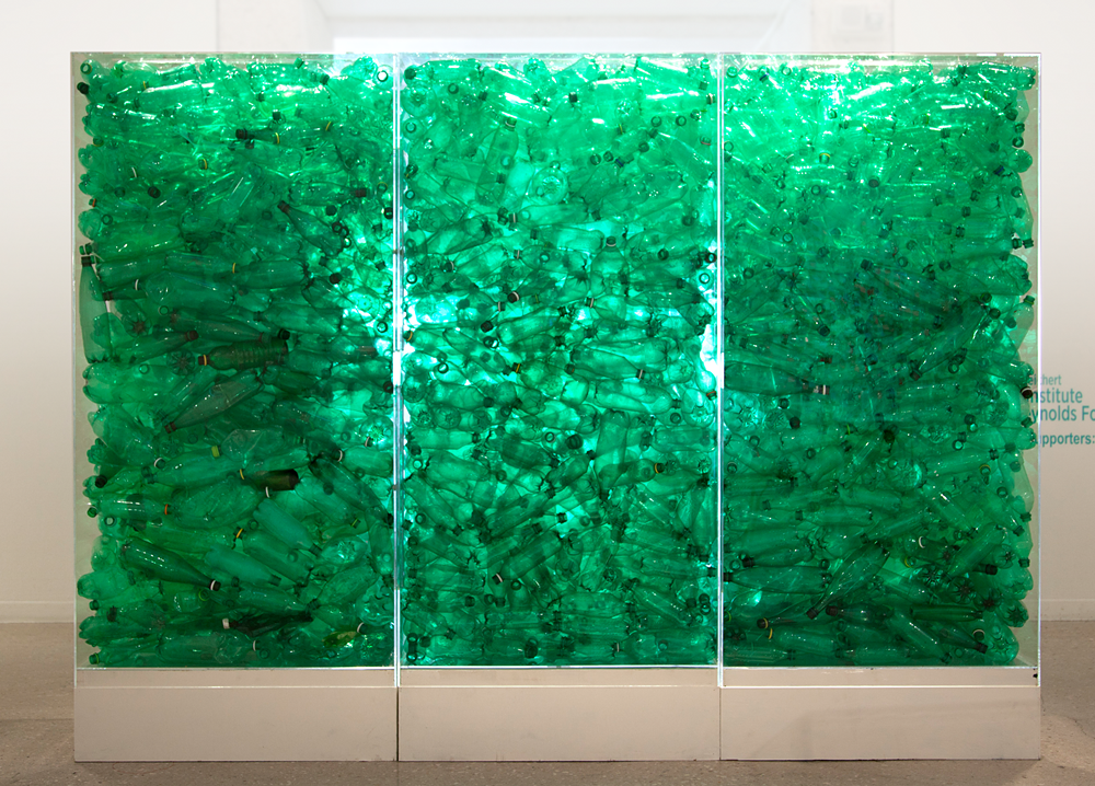 Shelia Rogers: Oceans of Plastic | Art Museum of South Texas | July – September 2014 The Pause that Refreshes 3 – 78 X 45 X 30 inches plastic beach trash soda bottles, Plexiglass, wood